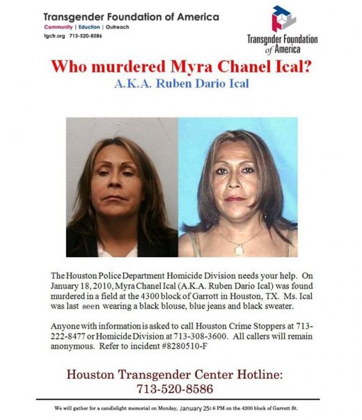 Houston, TX – Myra Ical lived and died as a transwoman, but the Houston media have not given her the dignity of acknowledging her gender identity when reporting on her likely hate murder. The Houston Chronicle reported Ical’s January 18 murder in the Montrose section using exclusively male pronouns, calling her male, and playing up the sensational aspects of the area where homeless people eek out a living. As is often sadly the case in reportage that is lazy and salacious, the Chronicle used innuendo to suggest that Ical, whose body was found partially naked and covered with bruises and defensive injuries indicative of her fight with her attacker(s), was consorting with prostitutes and drug addicts. Local and national LGBT rights organizations have pushed back against this media injustice by calling attention to Ms. Ical’s gender identity and expression, and demanding that reportage get this aspect of such a terrible story right. According to The Advocate, Human Rights Campaign board member and Pride Houston president Meghan Stabler submitted a strongly worded letter on behalf of both organizations to media outlets covering Ms. Ical’s murder, urging reporters to “use fair, accurate and inclusive reporting” when reporting on LGBT issues. The letter read, in part: “On Monday January 18 the brutal murder of Myra Ical occurred in Houston. She is a transgender woman but the media continue to use male pronouns along with colorful statements about being found in an area known for drugs and prostitution. This lazy and irresponsible journalism shows the amount of ignorance about transgender issues that is rampant among far too many reporters despite the existence of resources to help them report accurately.” GLAAD and the AP have clear guidelines on how LGBT-oriented stories should be reported, leaving big media like the Houston Chronicle without excuse. Myra Ical, who was 51 when she died, will be remembered at a candlelight vigil near the site of her murder at the corner of Richmond Avenue and Garrott Street on Monday, January 25, from 6-6:30 pm. The Facebook notice for the vigil calls upon media and the Houston Police Department “to communicate with the public in a way that respects the victim.” Thanks to Daniel Williams for breaking this story in the DFW metroplex.