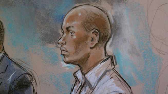 Officer Kenneth Furr appears in court to answer charges of shooting into transgender women's car (Bill Hennessy drawing).