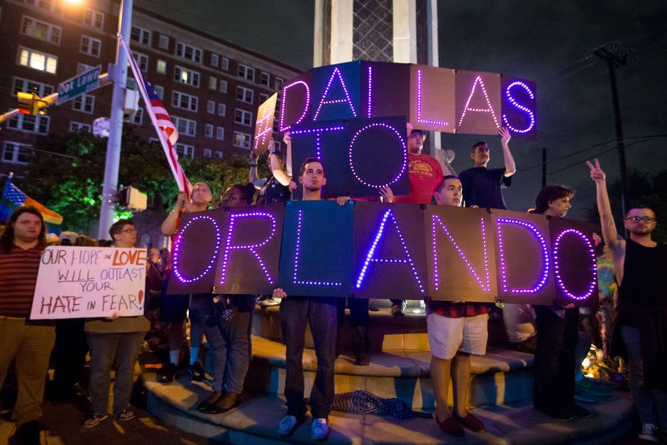Hundreds of LGBT Dallasites and allies rally in solidarity with Orlando despite the rain.