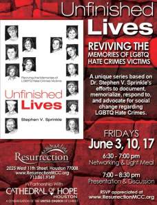 Houston, Texas – Reviving the memories of LGBTQ hate crimes murder victims will be the focus of three Gay Pride Month events sponsored by two gay-predominant churches and a national transgender organization in the Houston metropolitan area during June. Dr. Stephen Sprinkle, author of the ground-breaking book, Unfinished Lives, will present three programs on ways anti-gay hate violence must matter to everyone. Resurrection Metropolitan Community Church, the largest-membership MCC in the world, and Cathedral of Hope Houston, a United Church of Christ congregation planted by CoH Dallas, the world’s largest gay congregation, and the Transgender Foundation of America are the sponsors for this series. All events (June 3, 10, and 17) are open to the public free of charge and will be held on the campus of Resurrection MCC, 2025 West 1tth Street, Houston, Texas 77008, beginning each evening with a light meal at 6:30 p.m. Copies of his book will be on hand for purchase and signing by the author.