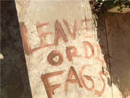 Clarendon, Texas – A gay couple have been put on notice that they are in danger by vandals in a small community an hour from Amarillo. Two weeks after an anti-gay diatribe by a local Church of Christ pastor appeared in the community newspaper, Joshua Harrison and Jeremy Jeffers found their front porch defaced by the scrawled warning, LEAVE OR DIE FAGS. The gay couple, partnered for better than a year, say they have never been so afraid for their lives.