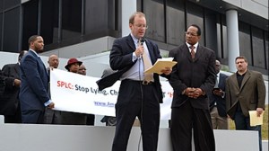 Liberty Counsel’s Matt Barber, a well-financed cadre of right-wing attorneys affiliated with Jerry Falwell’s Liberty Baptist University and Liberty Baptist Theological Seminary, said: “The SPLC has moved from monitoring actual hate groups like the KKK and neo-Nazis to slandering mainstream Christian organizations with that very same hate group label.” Barber went on to charge that “billions” of Jewish and Christian people were being “smeared” by the SPLC as hateful because they teach traditional Judeo-Christian values. Members of widely-known anti-gay hate organizations such as AFTAH, Americans for Truth About Homosexuality, and Abiding Truth Ministries also spoke. The themes they and their African American clergy supporters sounded at a press conference related to the protests included charges of unfairness, hating God, and spreading lies about these groups, all as instruments of “pro-gay politicking.”